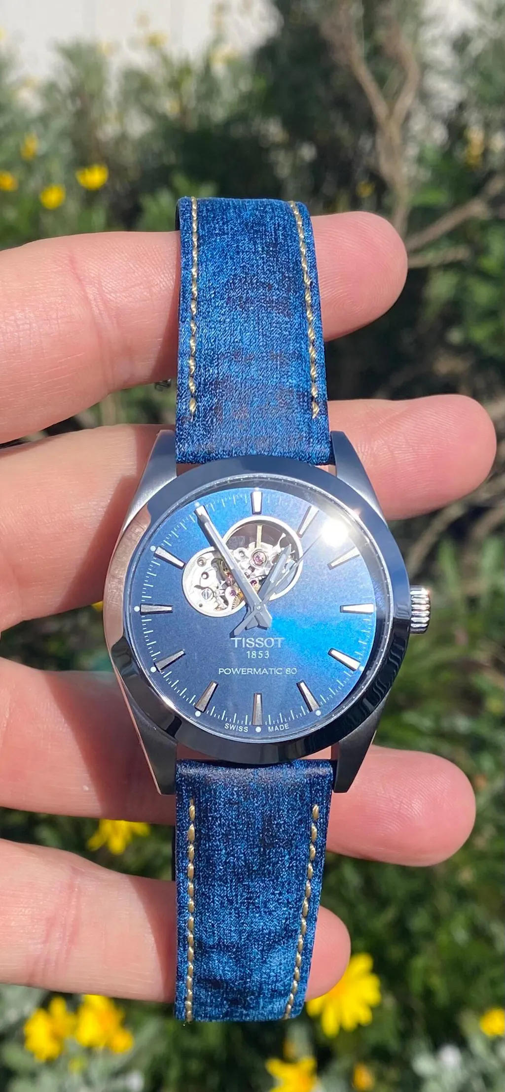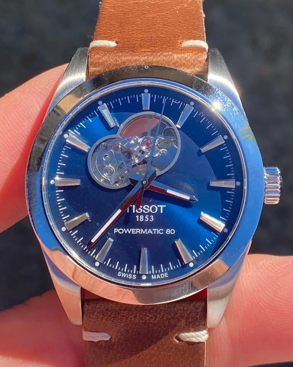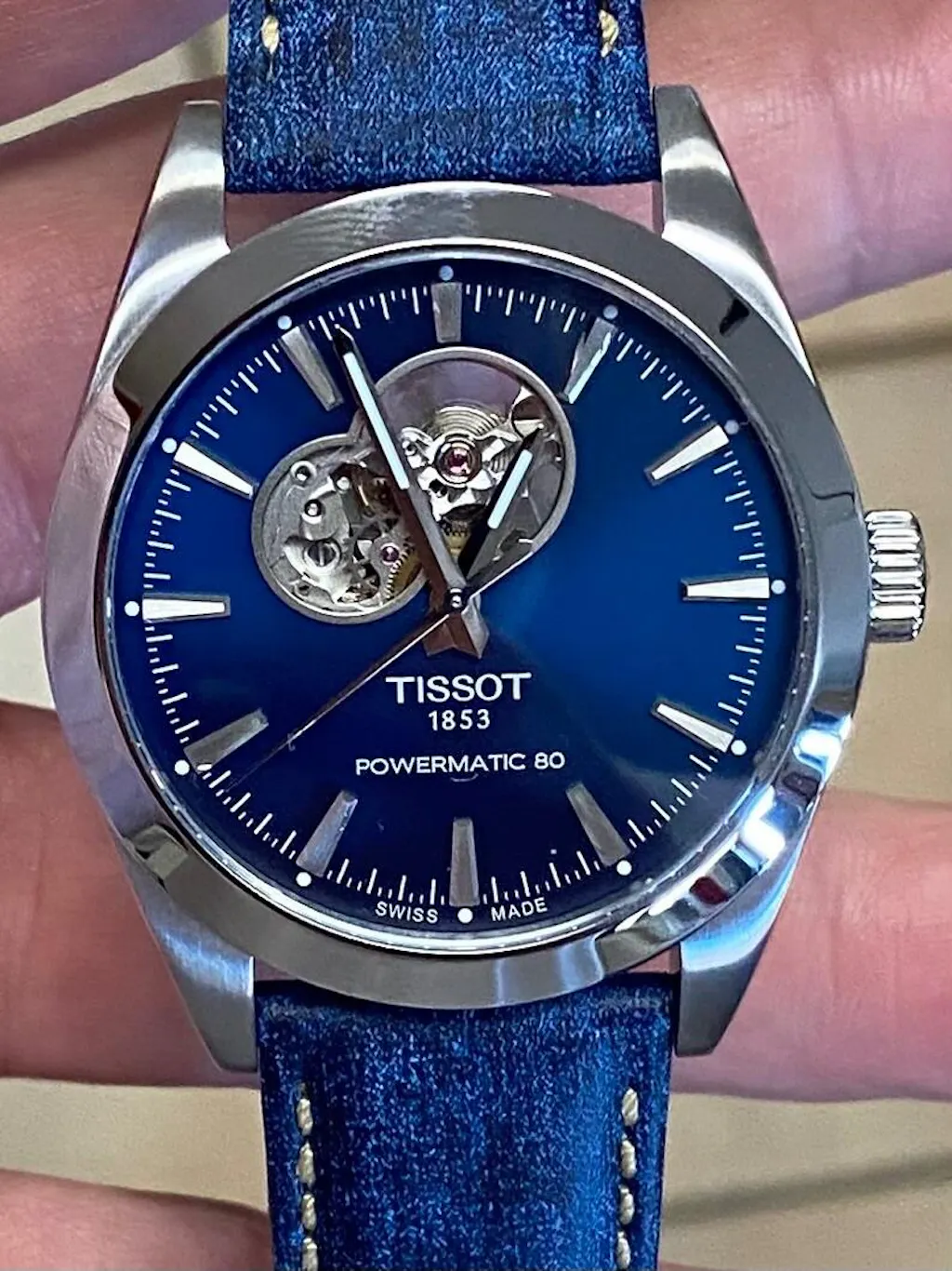 Tissot Gentleman Powermatic 80 Open Heart Stainless Steel Case Blue Dial Grey Strap Gent Watch T1274071104101.