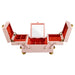 Storage 2 custom ring storage side handles, 1 removable tray with 4 ring rolls and 4 storage sections, 3 storage areas, 2 hidden storage areas, 4 necklace hooks and pocket, 1 storage envelope, fold away mirror.
